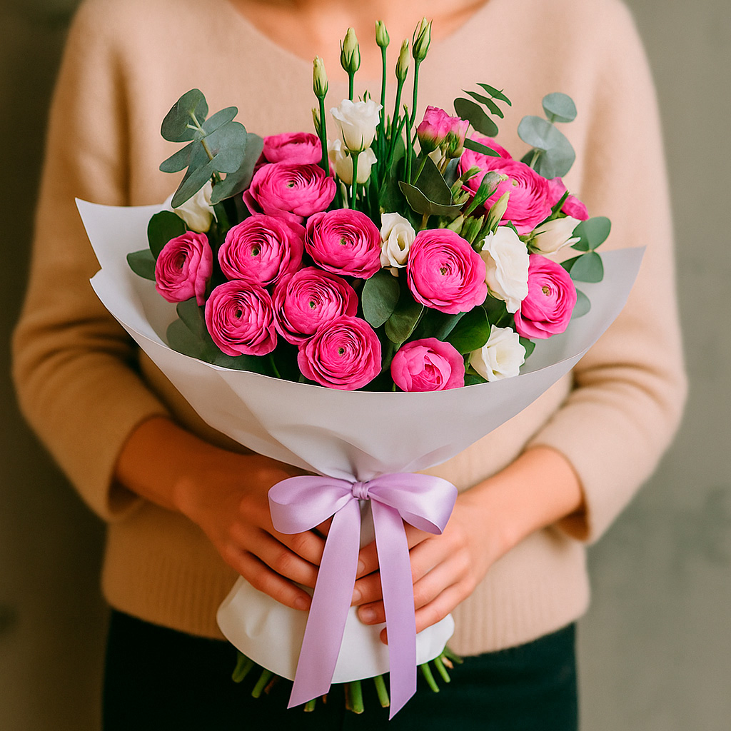 Розовые кустовые розы и белая эустома создают изысканную композицию с добавлением свежего эвкалипта. Букет оформлен в матовую плёнку и перевязан атласной лентой нежного розового цвета. Возможны альтернативы упаковки: крафт-бумага или декоративная сетка. Прекрасный выбор для любимой на годовщину или день рождения.