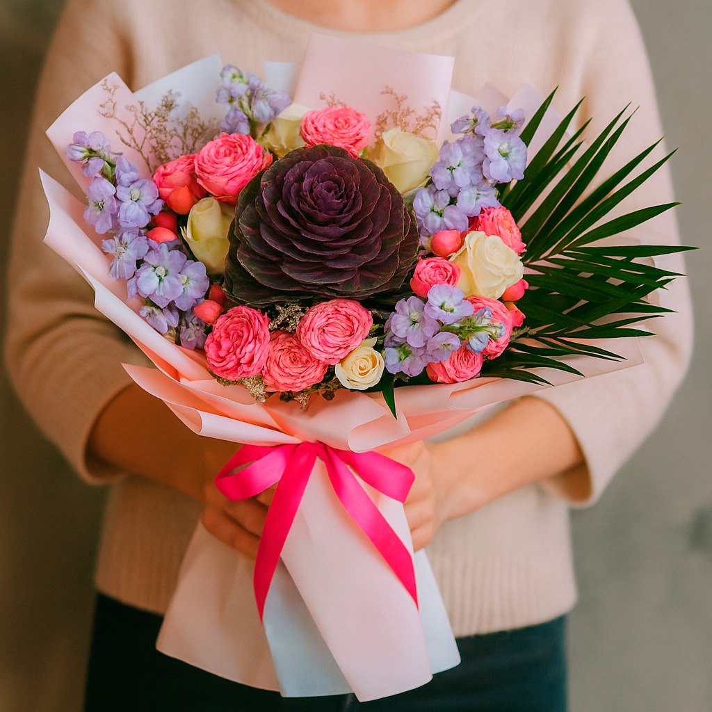 Яркий букет с брассикой, сиреневой маттиолой, розовыми кустовыми и кремовыми одноголовыми розами, дополненный листьями пальмы, создаёт атмосферу праздника. Упакован в матовую плёнку с розовой лентой, он выглядит особенно эффектно. Альтернативой может стать крафт-бумага или декоративная сетка. Прекрасный выбор для подарка на день рождения или для любимой.
