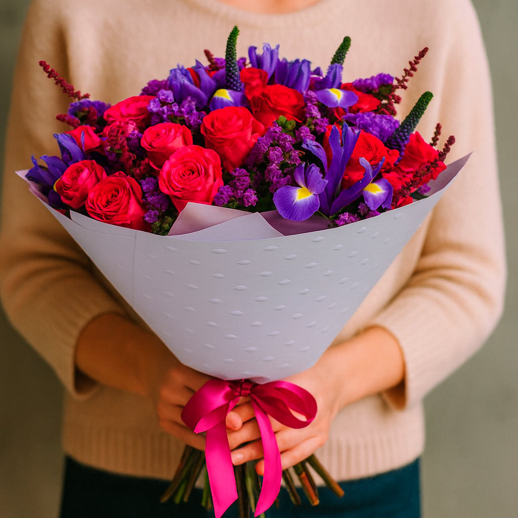 Розовые одноголовые розы и фиолетовые ирисы создают яркий и запоминающийся дуэт, дополненный изящной вероникой и фиолетовой статицей. Букет оформлен в матовой пленке с розовой атласной лентой. Возможны альтернативы: крафт-бумага или декоративная сетка. Прекрасный выбор на годовщину для любимой.