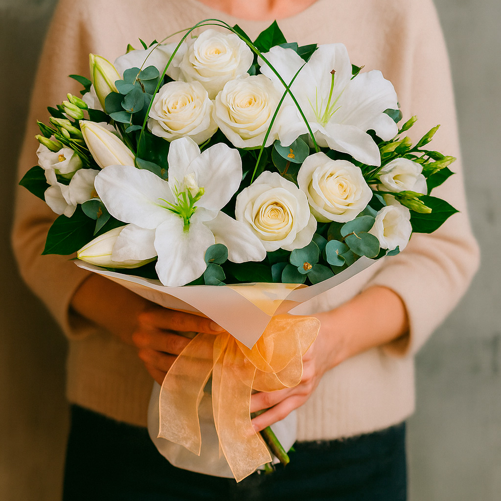 Белые розы, лилии и эустомы создают изысканную композицию, дополненную берграссом. Букет перевязан нежной лентой и обёрнут в матовую плёнку, что подчёркивает его элегантность. Возможны варианты упаковки с декоративной сеткой или крафт-бумагой. Прекрасный подарок для любимой на годовщину или свадьбу.