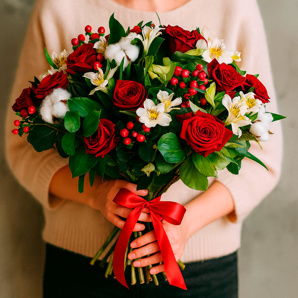 Красные одноголовые розы, белая альстромерия и гиперкум создают яркий контраст, дополняемый нежностью хлопка и свежестью зелени. Букет перевязан красной атласной лентой, что придаёт ему изысканность. Возможны альтернативы оформления с матовой плёнкой или крафт-бумагой. Прекрасный выбор для любимой на годовщину или день рождения.