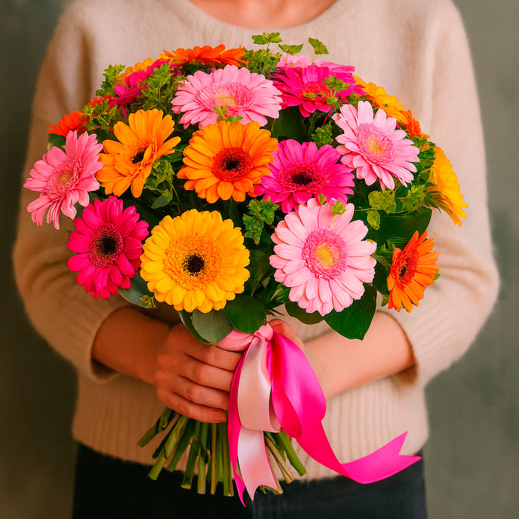Букет из свежих цветов «Герберовый микс» — это удивительное единство оттенков, в котором каждый элемент служит дополнением к другим. Своим разнообразием и гармонией цветочная композиция впечатляет, создавая атмосферу, которая запоминается надолго.