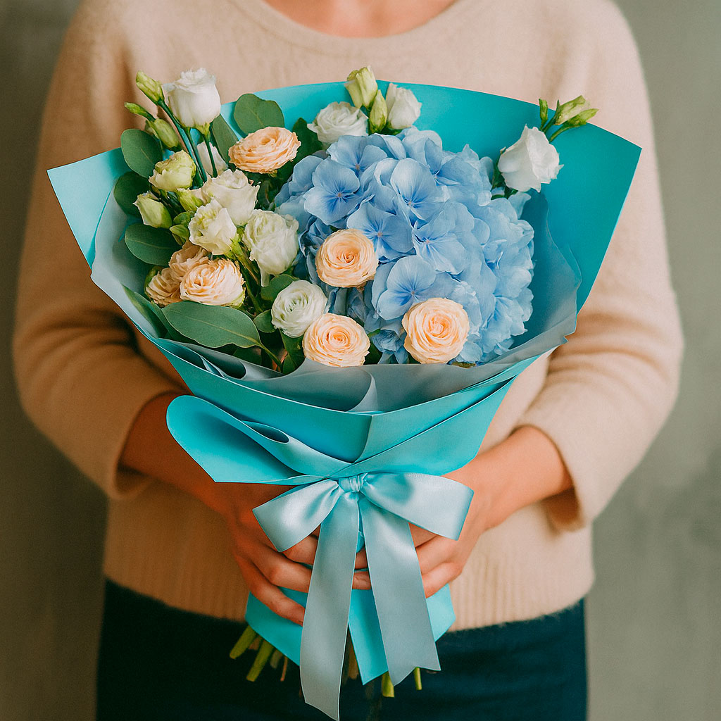 Голубая гортензия, белый лизиантус, кремовая кустовая роза и эвкалипт создают нежный и гармоничный ансамбль. Букет оформлен в матовую плёнку и перевязан атласной лентой, что подчёркивает его элегантность. Альтернативно можно использовать крафт-бумагу или декоративную сетку. Прекрасный подарок для мамы на день рождения или юбилей.