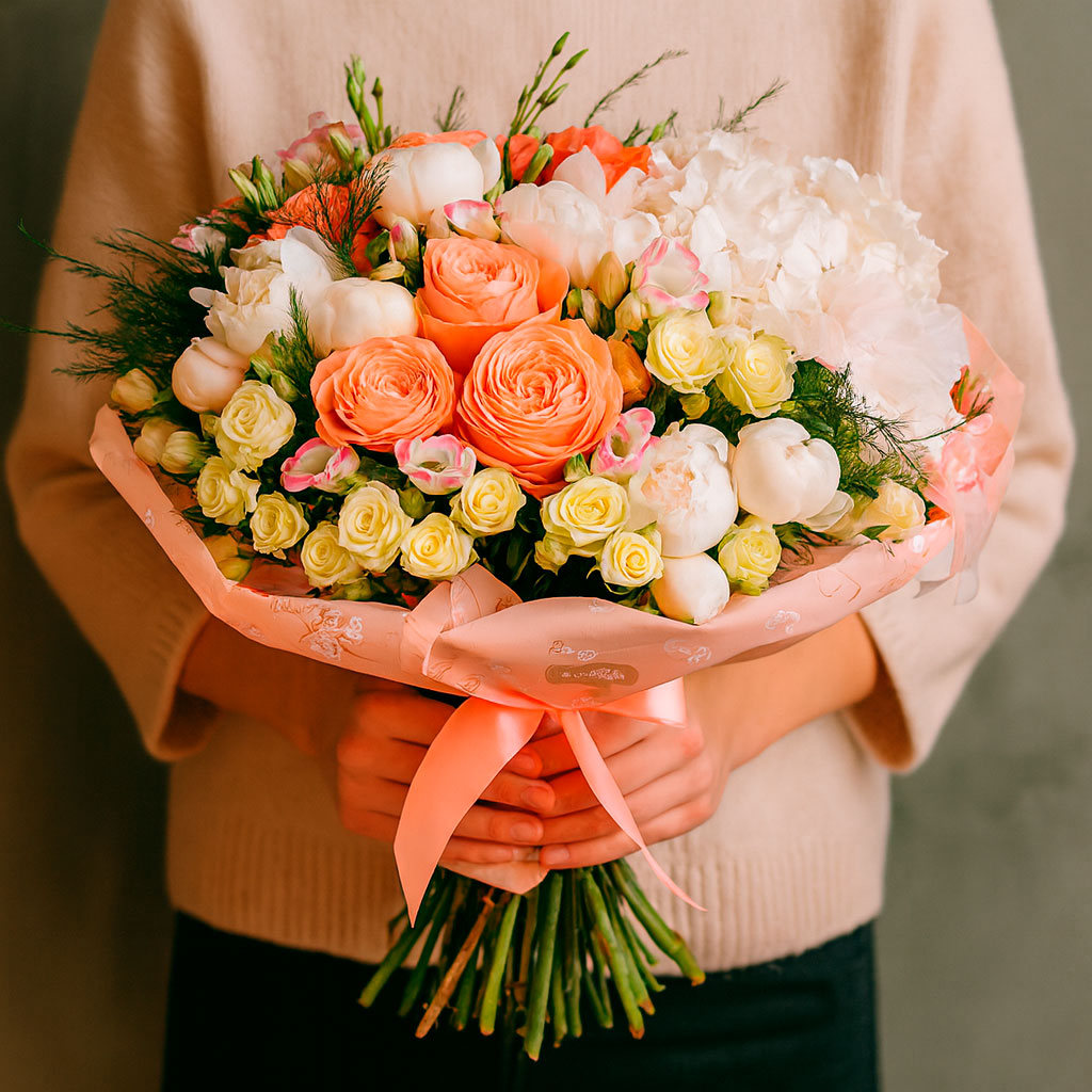 Нежное сочетание кремовых кустовых роз, персиковых пионовидных роз, белых пионов и гортензий, дополненное розовой эустомой, создаёт атмосферу утончённой элегантности. Букет перевязан изящной лентой и обёрнут в матовую плёнку, подчёркивая его изысканность. Возможны альтернативы упаковки: крафт-бумага или декоративная сетка. Прекрасный выбор для подарка на годовщину или для любимой.