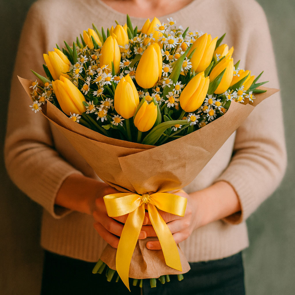 Яркие жёлтые тюльпаны в сочетании с нежными ромашками и зеленью фисташки создают атмосферу весеннего настроения. Букет оформлен в крафт-бумагу и перевязан жёлтой атласной лентой. Возможные альтернативы упаковки: матовая плёнка или декоративная сетка. Прекрасный подарок для мамы на День матери или для подруги на день рождения.