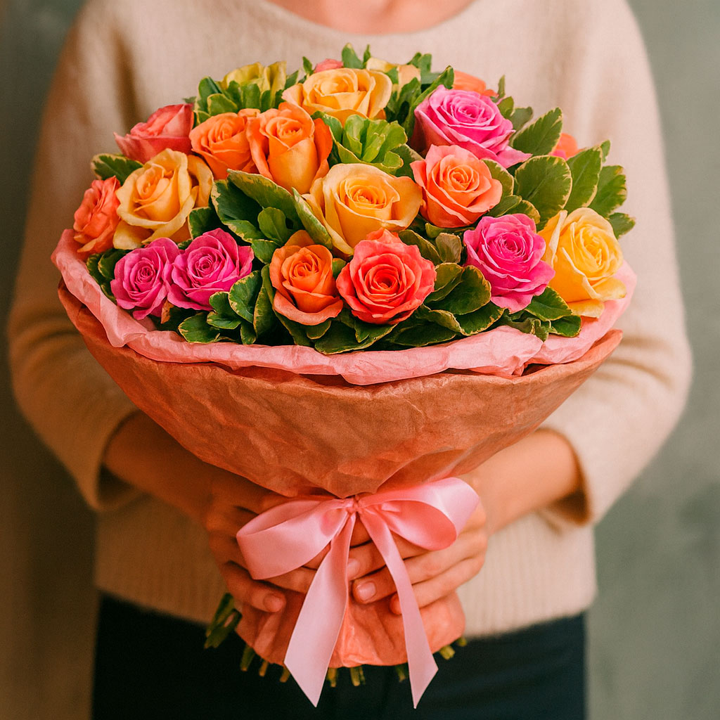 Яркие розы в жёлтых, персиковых и розовых оттенках, дополненные питтоспорумом, создают гармоничную композицию. Букет оформлен в крафт-бумагу и перевязан нежной розовой лентой. Возможны альтернативы упаковки: матовая плёнка или декоративная сетка. Прекрасный выбор для подарка на день рождения для любимой.