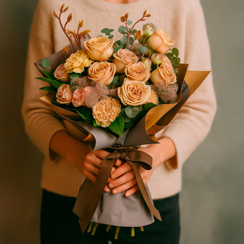 Элегантный букет с розами капучино, гвоздиками шампань и японским кустом, дополненный свежим эвкалиптом, создаёт атмосферу утончённости. Упакован в матовую плёнку и перевязан атласной лентой. Возможны варианты с крафт-бумагой или декоративной сеткой. Прекрасный выбор для годовщины или для любимой.
