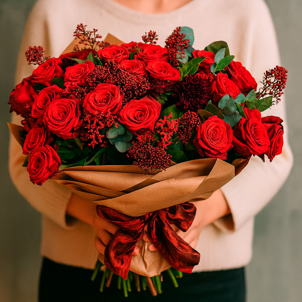 Роскошные красные розы в сочетании с декоративной зеленью и озотамнусом создают яркий и запоминающийся образ. Букет оформлен в крафт-бумагу и перевязан атласной лентой, что придаёт ему изысканность. Альтернативно можно использовать матовую плёнку или декоративную сетку. Прекрасный выбор для подарка на годовщину или для любимой.