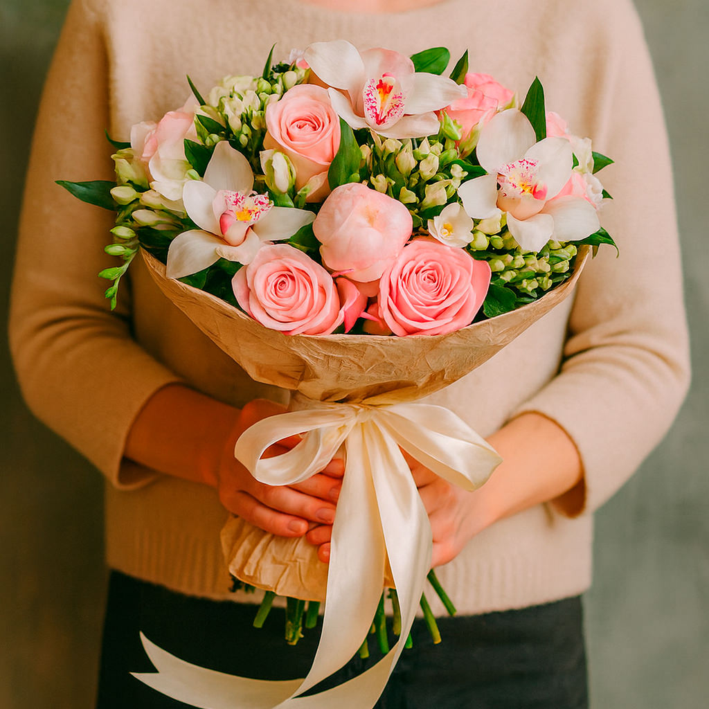 Белые орхидеи и фрезии создают нежный контраст с розовыми розами и пионами, окружёнными зеленью. Букет перевязан атласной лентой и упакован в крафт-бумагу. Возможны варианты упаковки с матовой плёнкой или декоративной сеткой. Прекрасный выбор для любимой на годовщину или день рождения.
