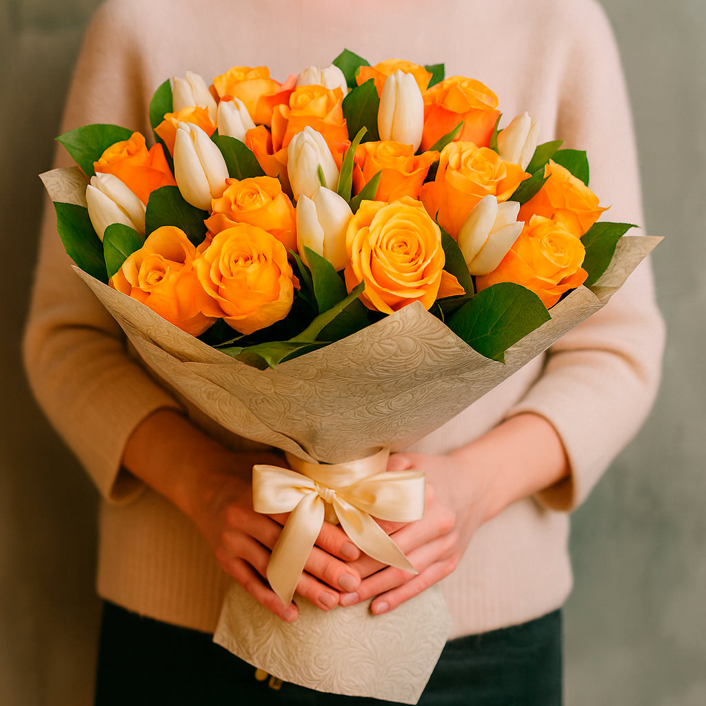 Персиковые розы и белые тюльпаны создают гармоничное сочетание, дополняемое свежей зеленью. Букет оформлен в изысканную матовую плёнку с атласной лентой. Возможны варианты упаковки с крафт-бумагой или декоративной сеткой. Прекрасный выбор для любимой на день рождения или годовщину.