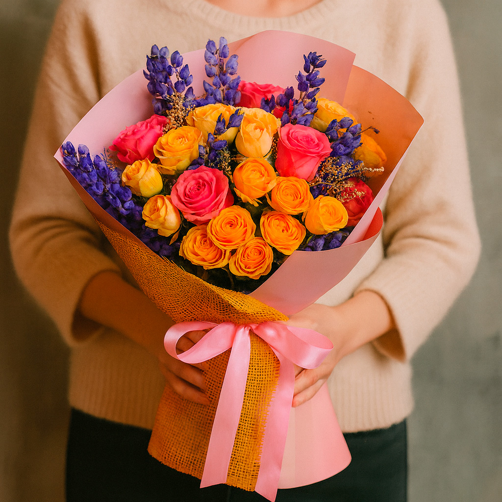 Погрузитесь в атмосферу нежности с букетом, сочетающим розовые одноголовые розы и жёлтые кустовые розы, дополненные синими лунариями и сухоцветами. Упакован в матовую плёнку и перевязан розовой атласной лентой, этот букет станет прекрасным подарком. Альтернативное оформление возможно с использованием крафт-бумаги или декоративной сетки. Подойдёт для поздравления любимой на годовщину или день рождения.