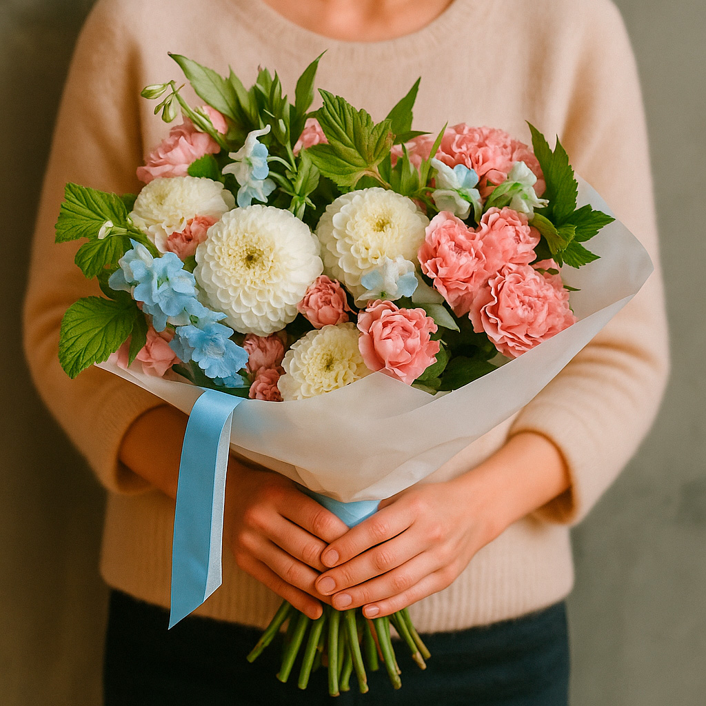 Белоснежные георгины, голубая маттиола и розовые кустовые розы создают нежную и воздушную композицию, дополненную свежими листьями малины. Букет перевязан голубой лентой и оформлен в матовую плёнку. Возможны варианты упаковки с атласной лентой или крафт-бумагой. Прекрасный подарок для любимой на годовщину или свадьбу.