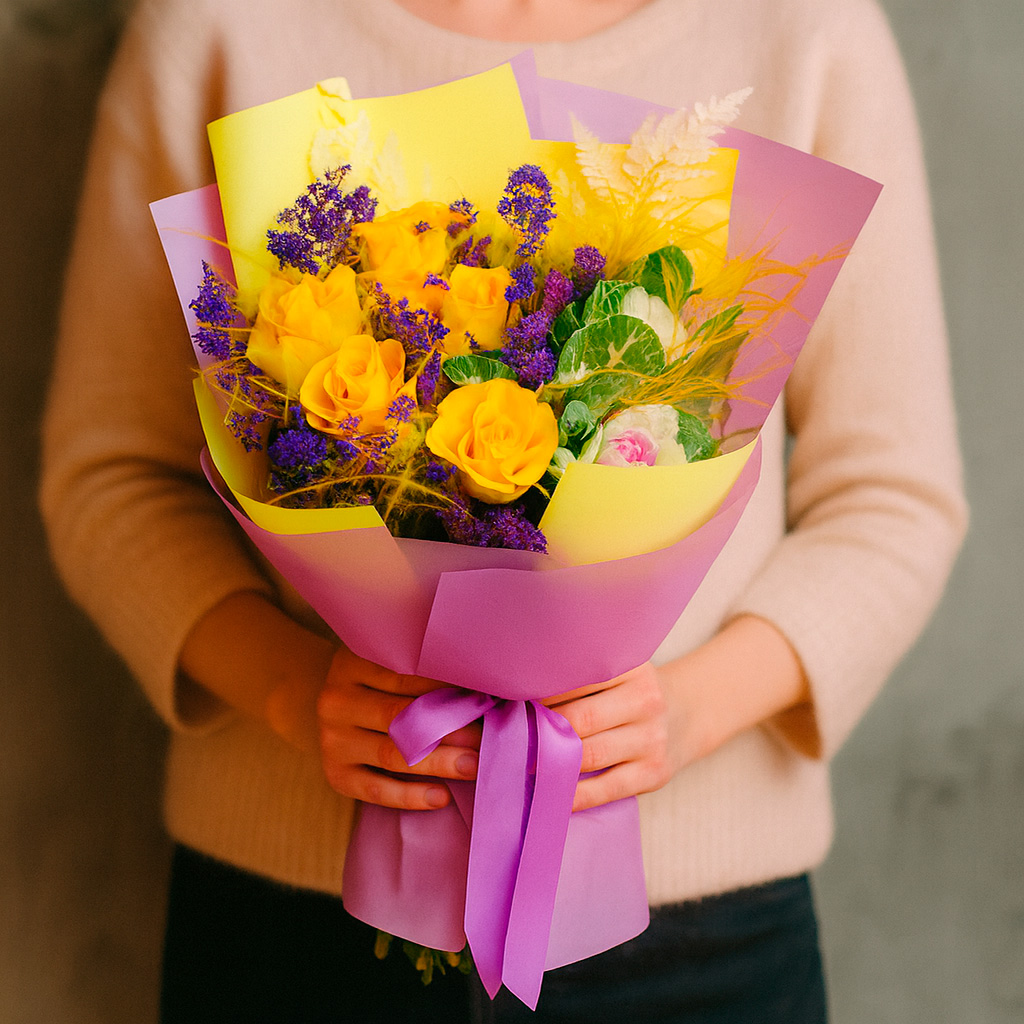 Яркие жёлтые розы и брассика в сочетании с нежными перьями и сухоцветами создают уникальную композицию. Букет оформлен в матовую плёнку с фиолетовой лентой, что подчёркивает его элегантность. Возможна упаковка в крафт-бумагу или декоративную сетку. Прекрасный подарок для любимой на день рождения или годовщину.