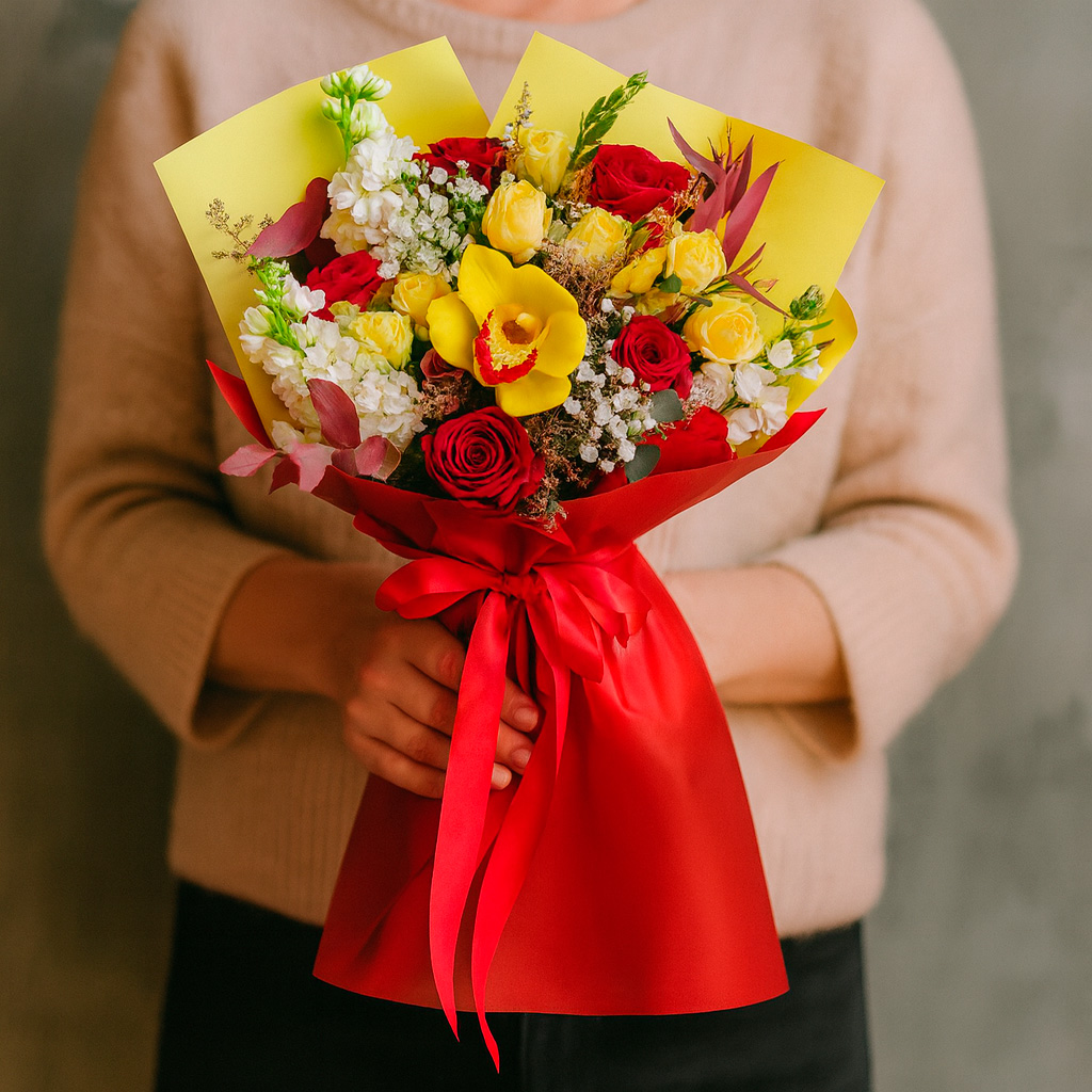 Яркий букет с жёлтыми орхидеями, красными одноголовыми розами и белой маттиолой создаёт атмосферу праздника. Кустовые жёлтые розы и нежная гипсофила дополняют композицию, а эвкалипт придаёт свежесть. Упакован в красную матовую плёнку с атласной лентой. Возможны альтернативы: крафт-бумага или декоративная сетка. Подойдёт для юбилея или для любимой.