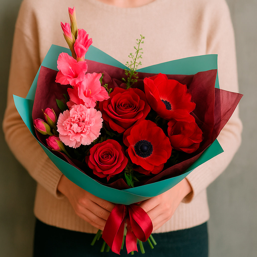 Яркий букет с амариллисом, красными анемонами и розами, дополненный розовыми кустовыми розами, гвоздиками и гладиолусами, создаёт атмосферу весеннего волшебства. Упакован в матовую плёнку и перевязан атласной лентой. Возможна упаковка в крафт-бумагу или декоративную сетку. Прекрасный выбор для подарка на юбилей для любимой.