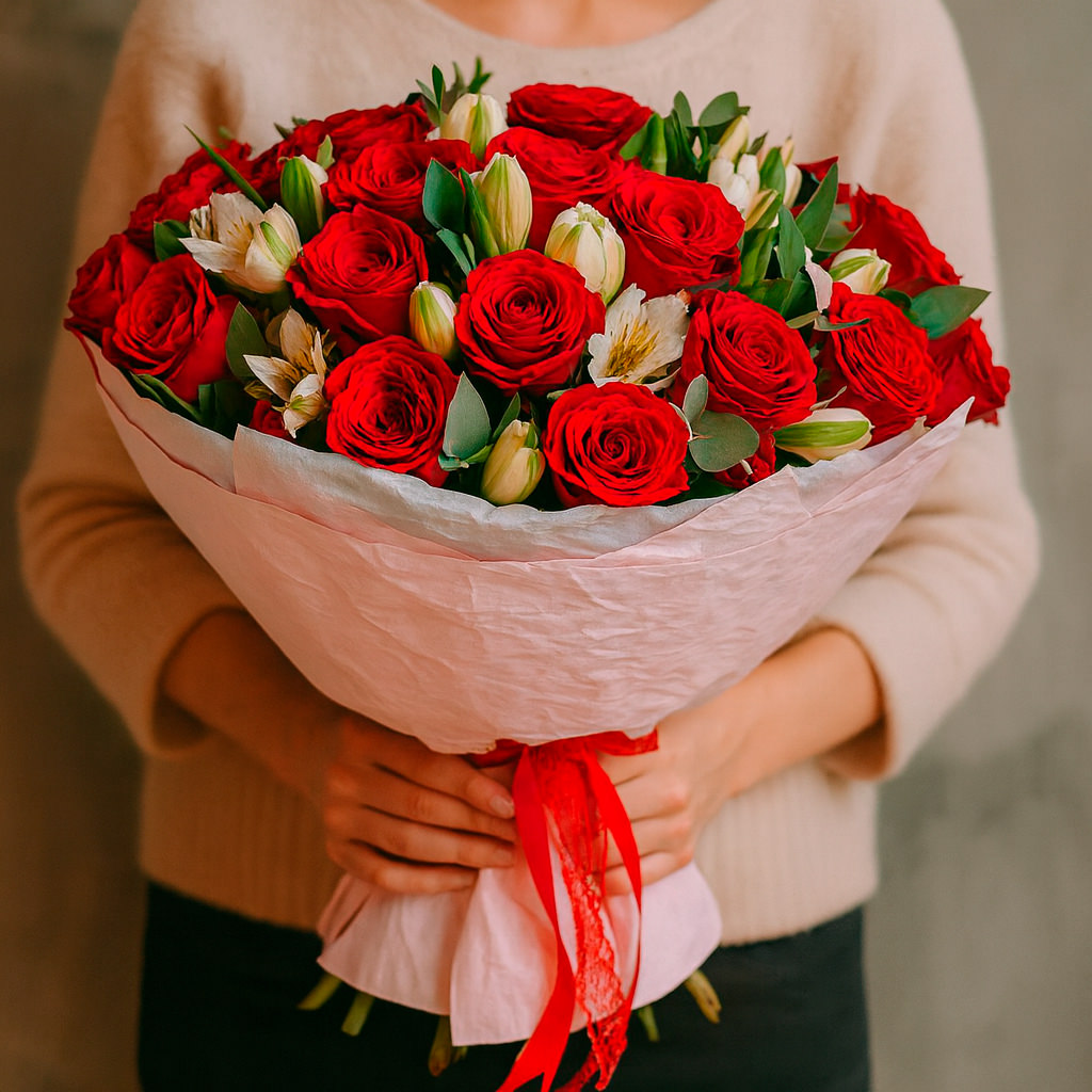 Яркое сочетание красных роз, белых альстромерий и тюльпанов, дополненное свежестью эвкалипта, создаёт настоящий карнавал эмоций. Букет оформлен в матовую плёнку с красной лентой, что придаёт ему изысканность. Возможна упаковка в крафт-бумагу или декоративную сетку. Прекрасный выбор для подарка на день рождения или для любимой.