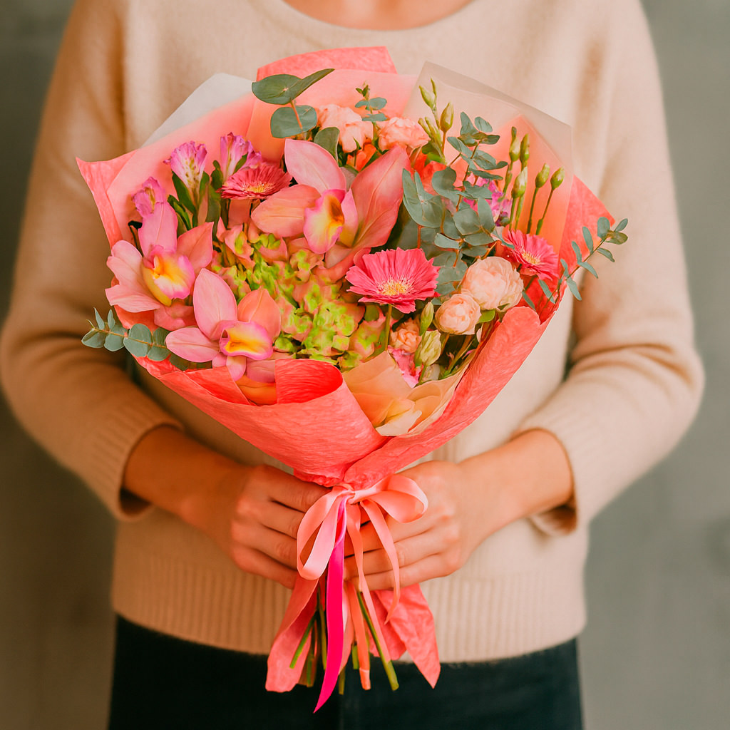 Роскошное сочетание розово-зеленой гортензии, розовых орхидей, альстромерий, гербер и эустом создаёт атмосферу тропической свежести. Букет перевязан атласной лентой и обёрнут в матовую плёнку, подчёркивая его элегантность. Возможны альтернативы упаковки: крафт-бумага или декоративная сетка. Прекрасный выбор для подарка на день рождения для любимой.