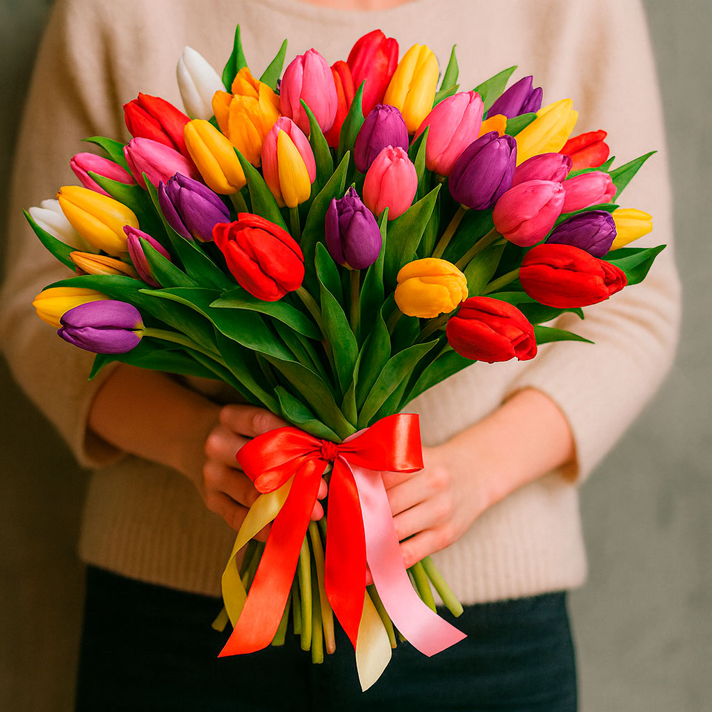 Яркие тюльпаны в миксе белого, жёлтого, оранжевого, красного, фиолетового и розового оттенков создают атмосферу весеннего праздника. Букет перевязан лентами разных цветов, добавляя нотку игривости. Возможны альтернативы упаковки с матовой плёнкой или крафт-бумагой. Прекрасный подарок для любимой на 8 марта или день рождения.
