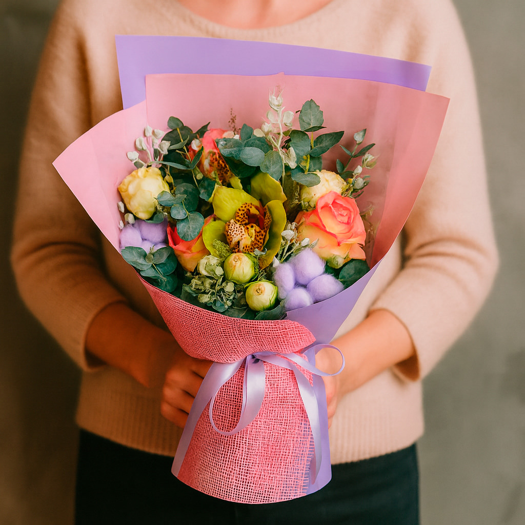 Роскошное сочетание желтых орхидей, розовых одноголовых роз и кустовых пионовидных роз создаёт атмосферу нежности и утончённости. Хлопок, эвкалипт и лунария добавляют композиции воздушности и свежести. Букет оформлен в матовую плёнку и перевязан атласной лентой. Альтернативные варианты упаковки могут включать крафт-бумагу или декоративную сетку. Прекрасный выбор для подарка на годовщину или для любимой.