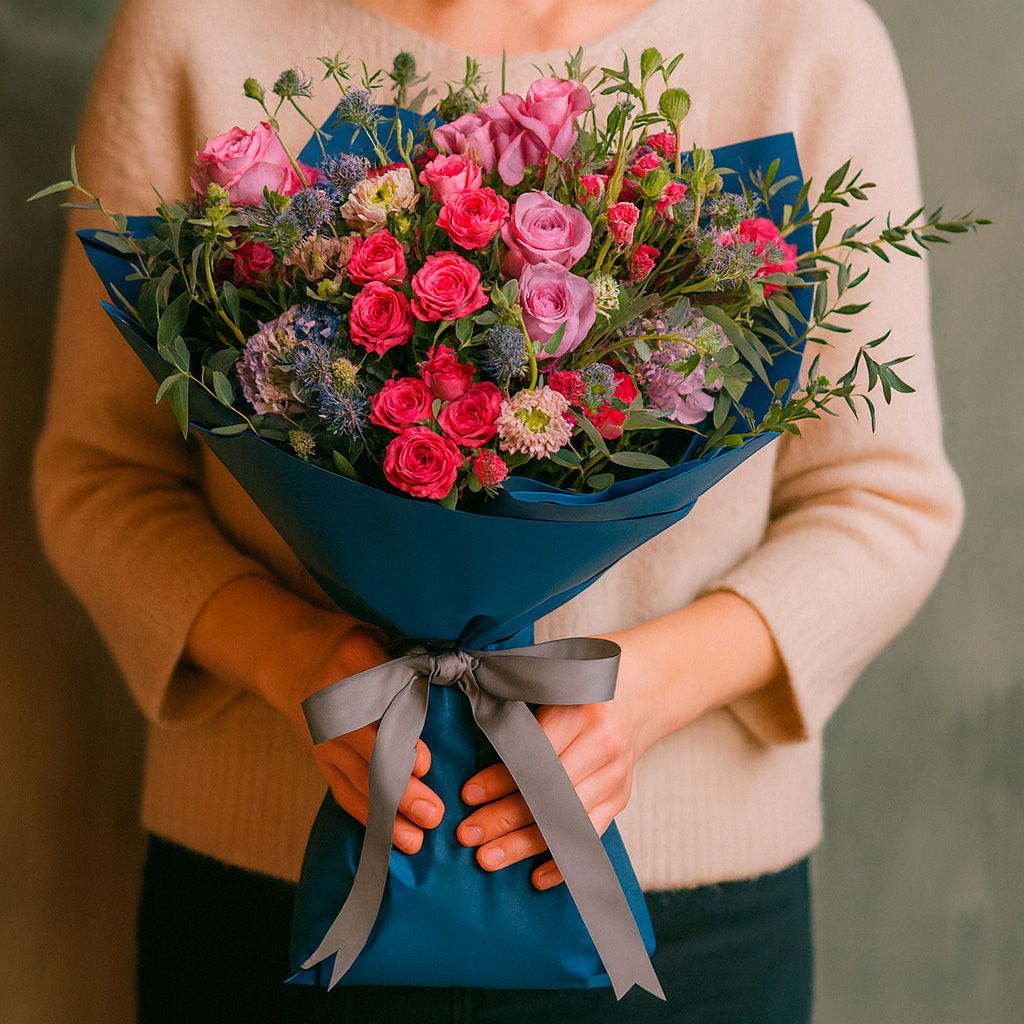 Роскошный букет из фуксийных и розовых кенийских роз, дополненный бело-синим ананасовым цветком и белой эустомой, создаёт гармоничную композицию с зеленью и эрингиумом. Упакован в элегантную синюю матовую плёнку с серой лентой. Возможны альтернативы упаковки: крафт-бумага или декоративная сетка. Прекрасный выбор для годовщины или для любимой.
