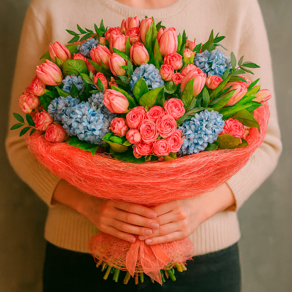 Голубые гиацинты, розовые кустовые розы и тюльпаны создают гармоничное сочетание с добавлением эвкалипта. Букет оформлен в розовую декоративную сетку, что придаёт ему особую нежность. Возможны альтернативы упаковки: атласная лента или матовая плёнка. Прекрасный выбор для подарка на день рождения для любимой.