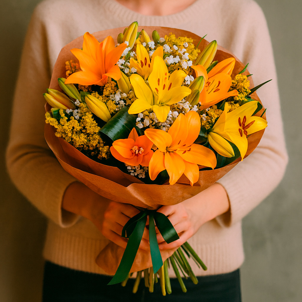 Яркие жёлтые и оранжевые лилии в сочетании с белоснежной гипсофилой и свежей зеленью создают атмосферу солнечного праздника. Букет оформлен в крафт-бумагу и перевязан атласной лентой зелёного цвета. Альтернативно можно использовать матовую плёнку или декоративную сетку. Прекрасный выбор для подарка на день рождения для любимой или подруги.
