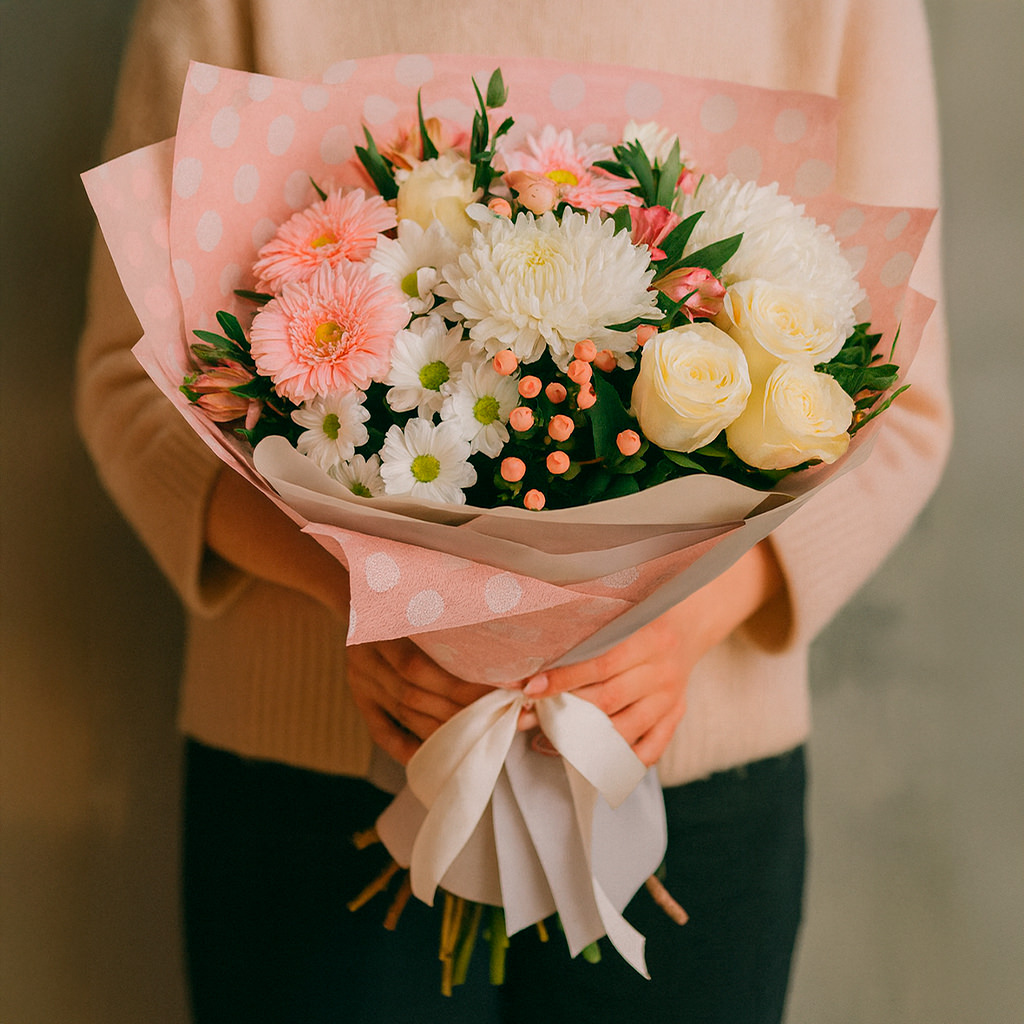 Кремовые розы, розовые герберы и белые хризантемы создают гармоничный и нежный ансамбль, дополненный розовыми альстромериями и гиперикумом. Букет оформлен в матовую плёнку и перевязан атласной лентой, что придаёт ему изысканность. Возможны варианты упаковки с крафт-бумагой или декоративной сеткой. Прекрасный выбор для подарка на день рождения для любимой или жены.