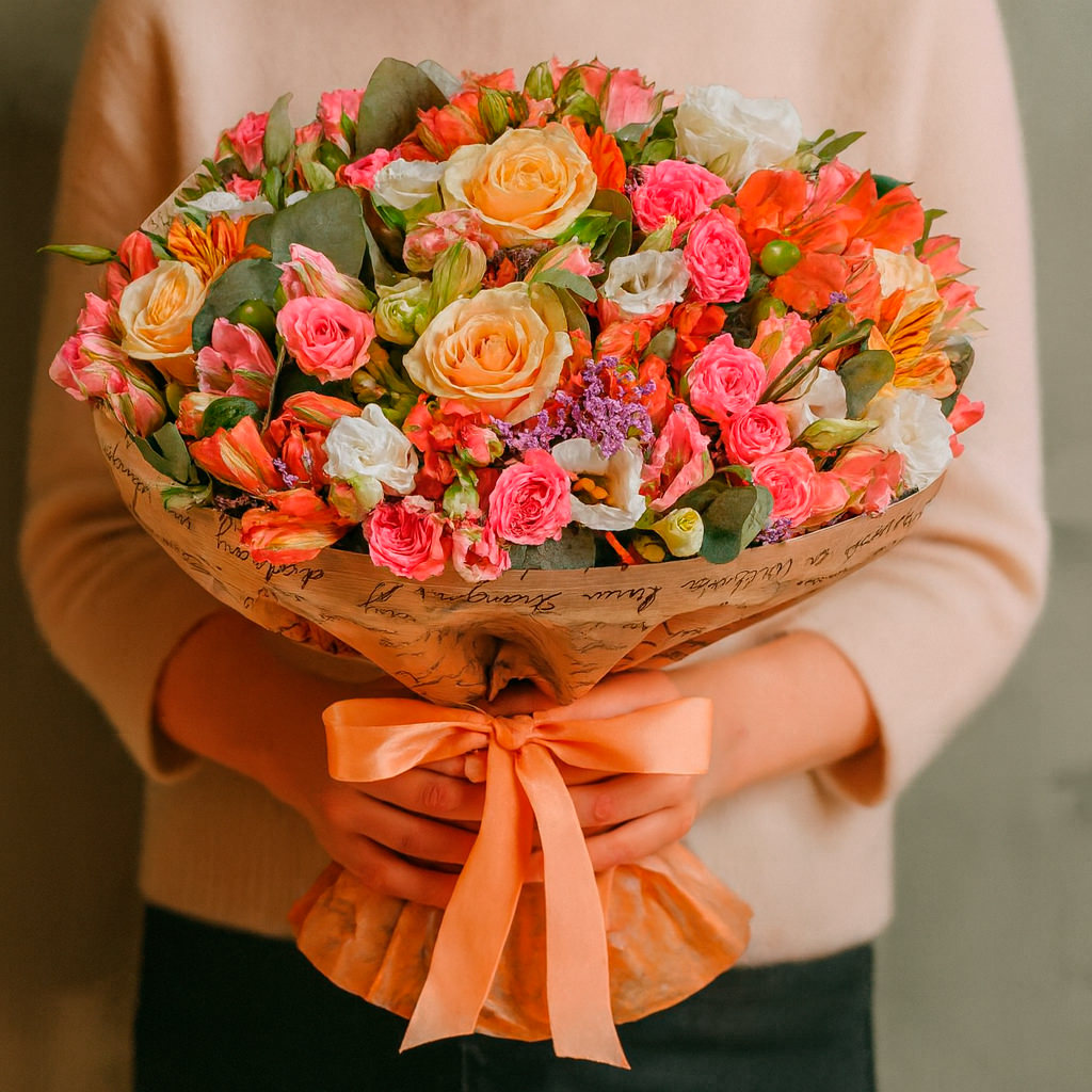 Роскошное сочетание кремовых одноголовых роз, розовых кустовых роз, оранжевых и розовых альстромерий, белой эустомы, эвкалипта и лимониума создаёт неповторимую композицию. Букет оформлен в крафт-бумагу с матовой плёнкой и перевязан атласной лентой нежного персикового оттенка. Альтернативно можно использовать декоративную сетку или фетр. Прекрасный выбор для подарка на день рождения для любимой.