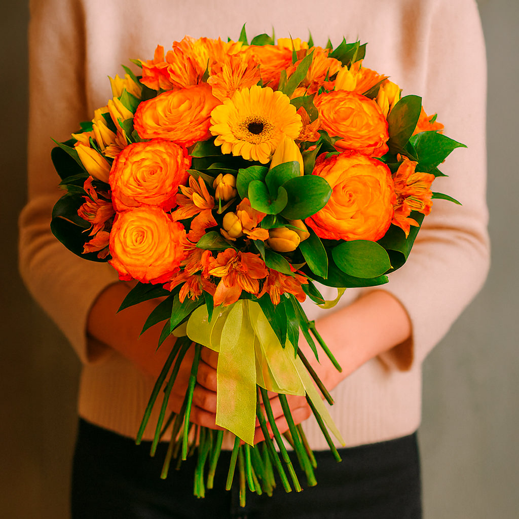 Яркие рыжие розы, жёлтые герберы и тюльпаны, а также оранжевые альстромерии создают солнечное настроение в этом букете. Композиция дополнена свежей зеленью и перевязана изящной лентой. Возможны альтернативы упаковки: матовая плёнка или крафт-бумага. Прекрасный выбор для подарка на день рождения для любимой или мамы.