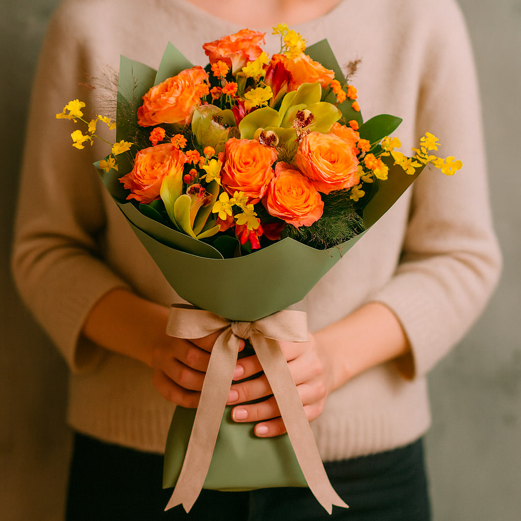 Оранжевые розы, жёлтые орхидеи и красные альстромерии создают яркую и жизнерадостную композицию, дополненную оранжевым ваксфлауэром и зеленью. Букет оформлен в матовую плёнку нежного зелёного оттенка и перевязан атласной лентой. Возможны альтернативы упаковки: крафт-бумага или декоративная сетка. Прекрасный выбор для поздравления на день рождения для любимой или подруги.