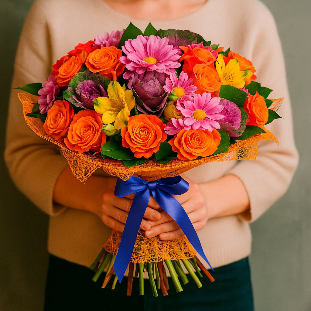 Сочетание сиреневых кустовых хризантем, оранжевых роз, жёлтых альстромерий и изысканной брассики создаёт яркий и запоминающийся образ. Букет оформлен в оранжевую декоративную сетку и перевязан синей лентой, подчеркивающей его элегантность. Альтернативные варианты упаковки: атласная лента или матовая плёнка. Прекрасный выбор для подарка на день рождения для любимой или на юбилей для мамы.