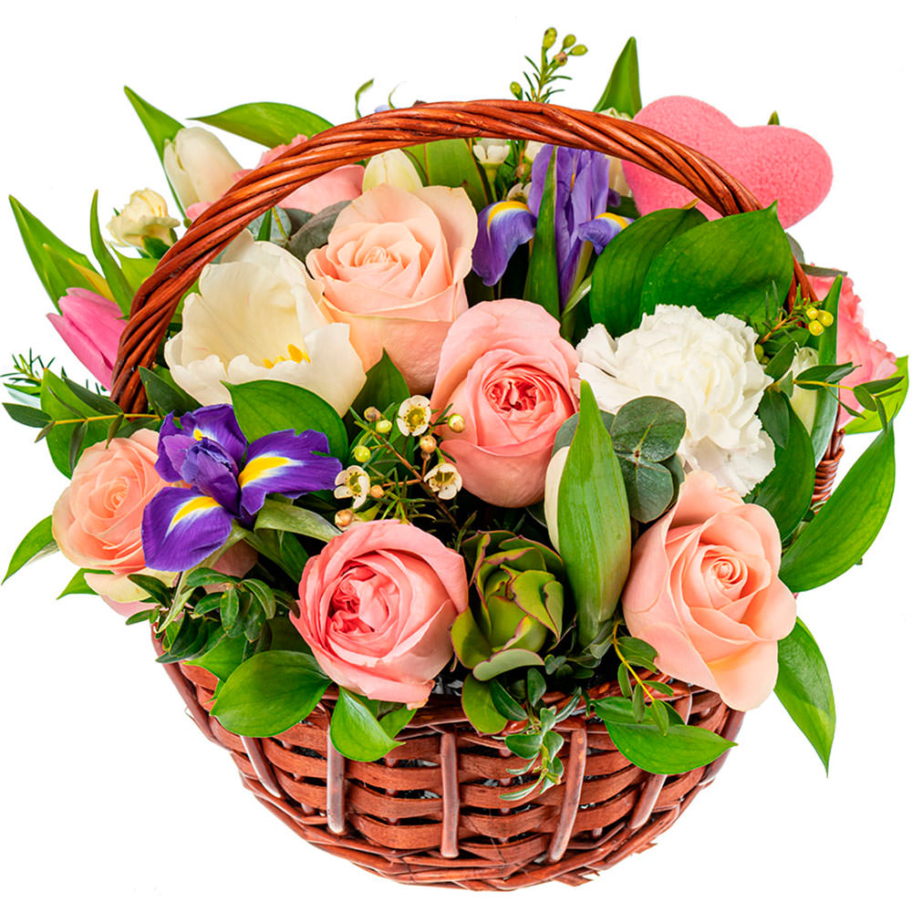 Розовые розы, белые тюльпаны и гвоздики, ирисы и ваксфлауэр создают яркую и нежную композицию. Корзина из лозы добавляет естественности и изящества. Возможны варианты с корзиной из ротанга или с тканевой отделкой. Прекрасный подарок для любимой на 8 марта или день рождения.