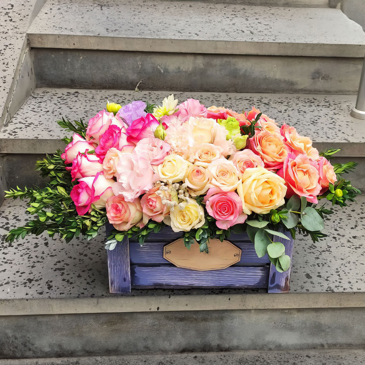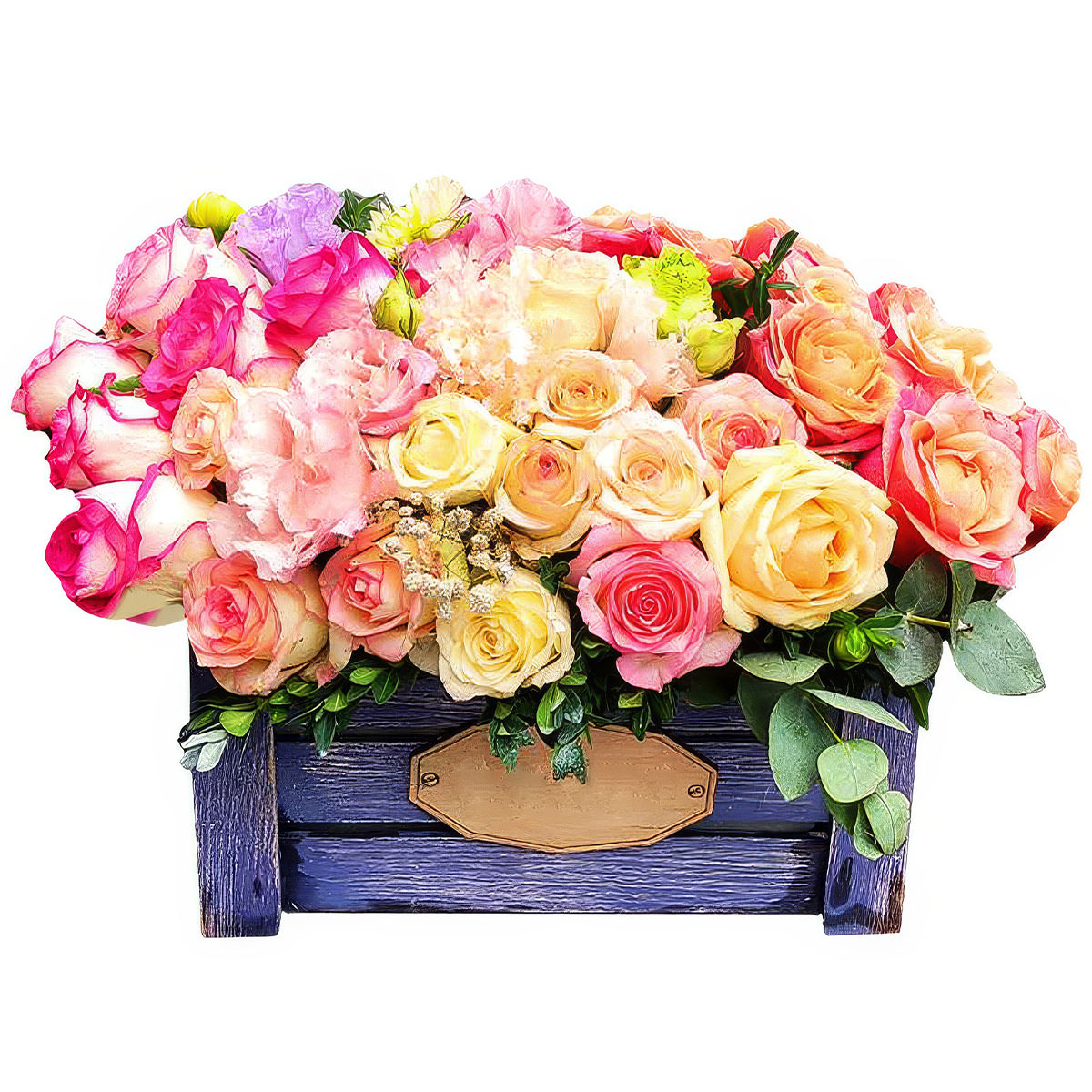 Яркие одноголовые розы разных оттенков, розовая эустома, гипсофила и эвкалипт создают атмосферу летнего тепла. Цветы размещены в стильном ящике с оазисом, что обеспечивает их свежесть и долговечность. Возможны альтернативы оформления в плетёной корзине или корзине из лозы. Прекрасный подарок для любимой на годовщину или день рождения.