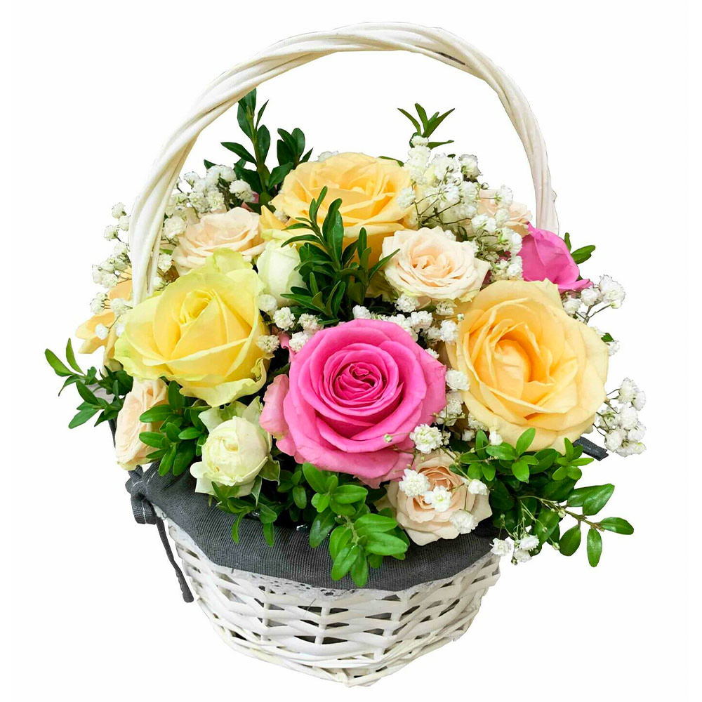 Яркие розы в желтых и розовых тонах, дополненные нежной гипсофилой и зеленью фисташки, создают атмосферу весеннего настроения. Белая плетёная корзина добавляет элегантности композиции. Возможна альтернатива с корзиной из ротанга или тканевой отделкой. Прекрасный подарок для мамы на День матери или для любимой на годовщину.