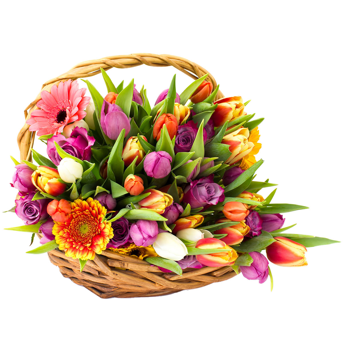 Эта корзина с цветами сочетает в себе яркие оттенки гербер, роз и тюльпанов. Жёлтые, розовые и оранжевые герберы гармонично дополняются сиреневыми розами и разноцветными тюльпанами. Корзина выполнена из натурального материала, что придаёт композиции естественность и уют. Возможны альтернативы оформления: корзина из лозы или плетёная корзина. Прекрасный подарок для любимой на день рождения или юбилей.