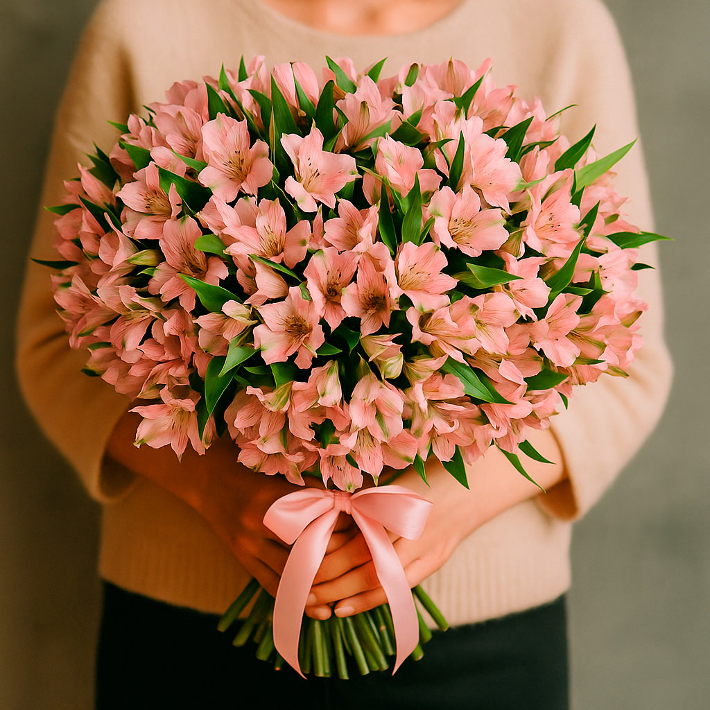 Розовые альстромерии создают нежное и романтичное настроение. Букет перевязан атласной лентой пастельного оттенка, что подчёркивает его изысканность. Альтернативно можно использовать матовую плёнку или крафт-бумагу. Прекрасный выбор для любимой на 8 марта.
