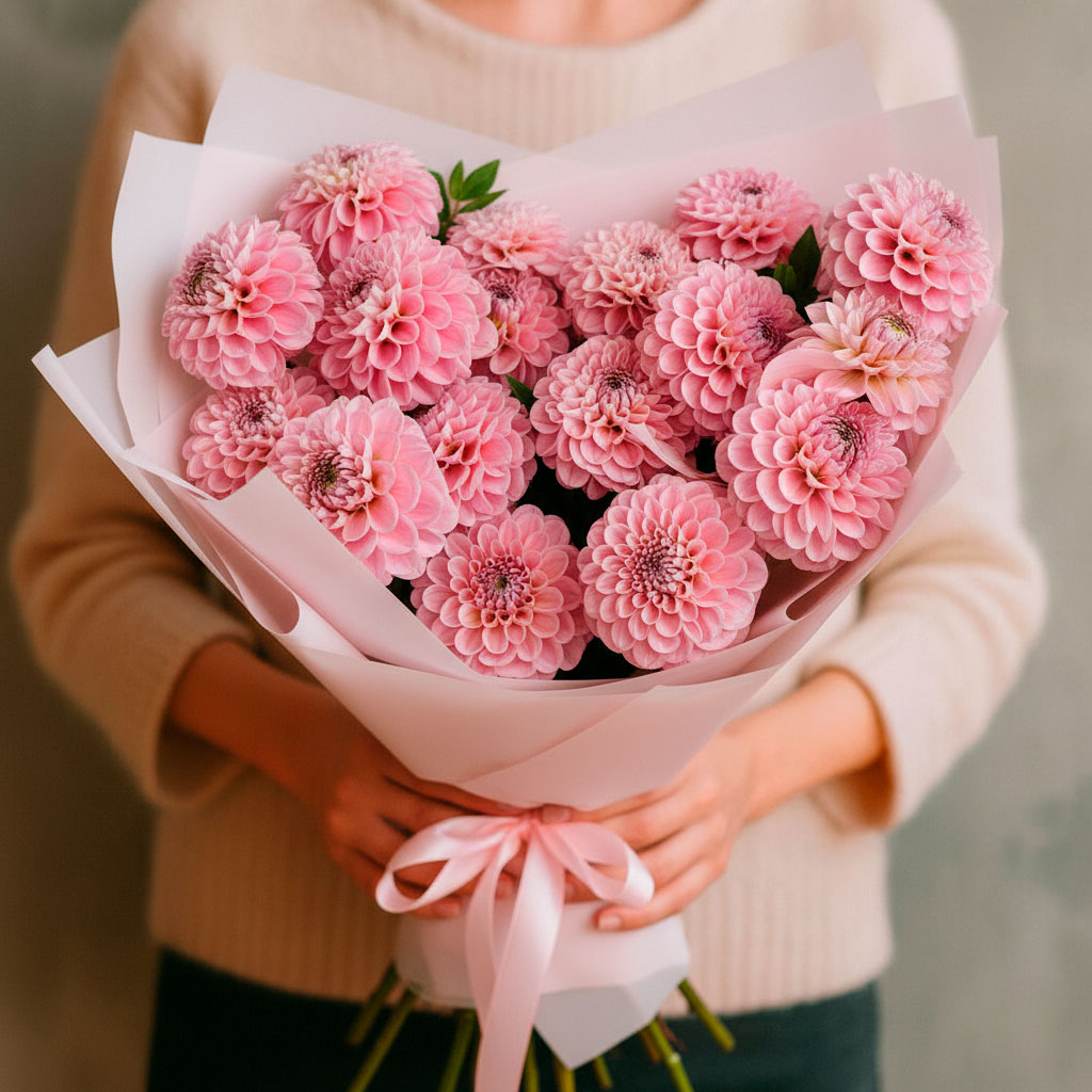 Роскошные розовые георгины создают изысканный и нежный образ. Букет перевязан атласной лентой в красивой упаковке, что придаёт ему элегантность. Возможны альтернативы оформления: матовая плёнка или крафт-бумага. Прекрасный выбор для подарка на день рождения для любимой.