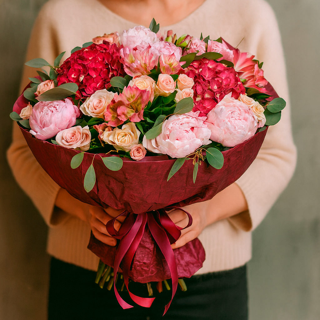 Роскошное сочетание розовых пионов, нежной гортензии и кремовых роз создаёт атмосферу утончённой элегантности. Композиция дополнена розовой альстромерией и свежим эвкалиптом, придающим букету лёгкость и свежесть. Упакован в матовую плёнку и перевязан атласной лентой бордового цвета. Альтернативные варианты оформления: крафт-бумага или декоративная сетка. Подходит для подарка на день рождения или для любимой.