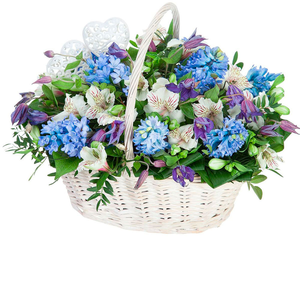 Голубые гиацинты и фиолетовые климатисы создают яркий акцент в этой корзине, дополненной белыми альстромериями и зеленью фисташки и аспидистры. Корзина выполнена из белого плетёного материала, что придаёт ей лёгкость и элегантность. Возможны альтернативы оформления: корзина из лозы или ротанга. Прекрасный подарок для любимой на годовщину или день рождения.