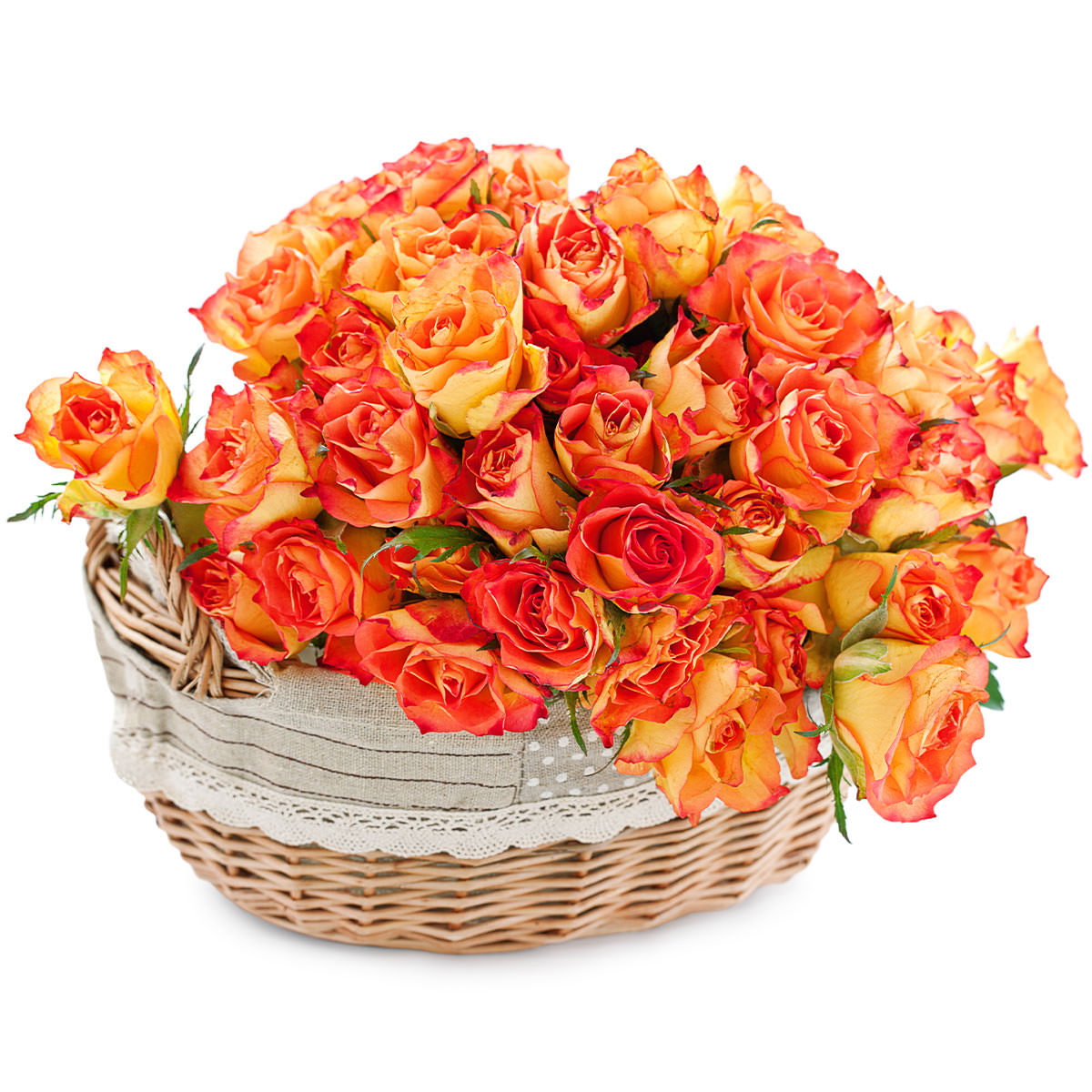 Яркие оранжевые розы, собранные в плетёную корзину, создают атмосферу тепла и радости. Корзина из лозы с тканевой отделкой придаёт композиции особый шарм. Возможны альтернативы оформления: корзина из ротанга или овальная корзина. Подойдёт для подарка на день рождения или для любимой.
