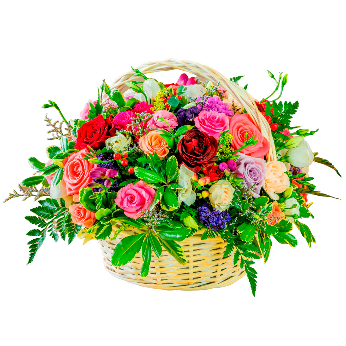 Пышная корзина с розами разных цветов, кустовыми розами, гиперикумом, сиреневой гвоздикой и белой эустомой создаёт яркий и живописный образ. Корзина из ротанга подчёркивает естественную красоту цветов. Возможны альтернативы оформления: корзина из лозы или с тканевой отделкой. Прекрасный выбор на день рождения для любимой или подруги.