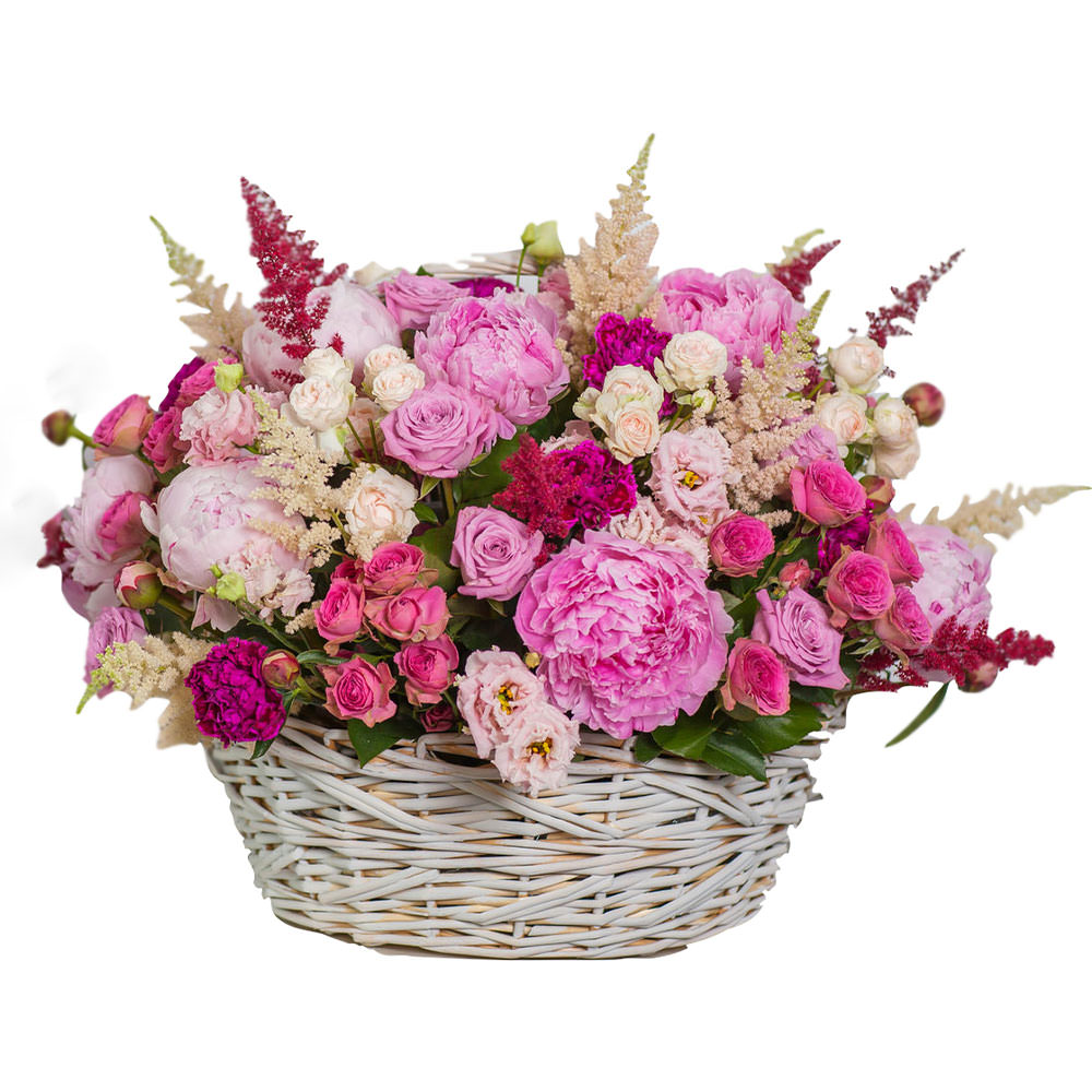 Роскошная композиция из кустовых кремовых и розовых роз, розовых пионов, астильбы и розовой эустомы создаёт атмосферу нежности и утончённости. Белая плетёная корзина подчёркивает изысканность цветов. Возможны альтернативы оформления: корзина из лозы или ротанга. Идеально для подарка на годовщину или для любимой.