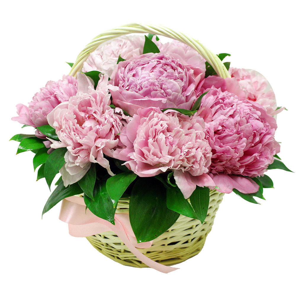 Роскошные розовые пионы в сочетании с зеленью создают нежную и изысканную композицию. Цветы расположены в плетёной корзине, что придаёт им особую элегантность. Для альтернативного оформления можно выбрать корзину из лозы или с тканевой отделкой. Прекрасный подарок для любимой на годовщину или для мамы на день рождения.
