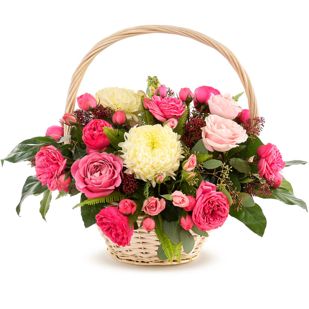 Яркая композиция из розовой кустовой розы, белой хризантемы, скимии и розовой одноголовой розы в сочетании с папоротником, эвкалиптом и аралией. Корзина из светлого ротанга добавляет естественности и лёгкости. Альтернативные варианты оформления: корзина из лозы или плетёная корзина. Прекрасный подарок для любимой на день рождения или годовщину.