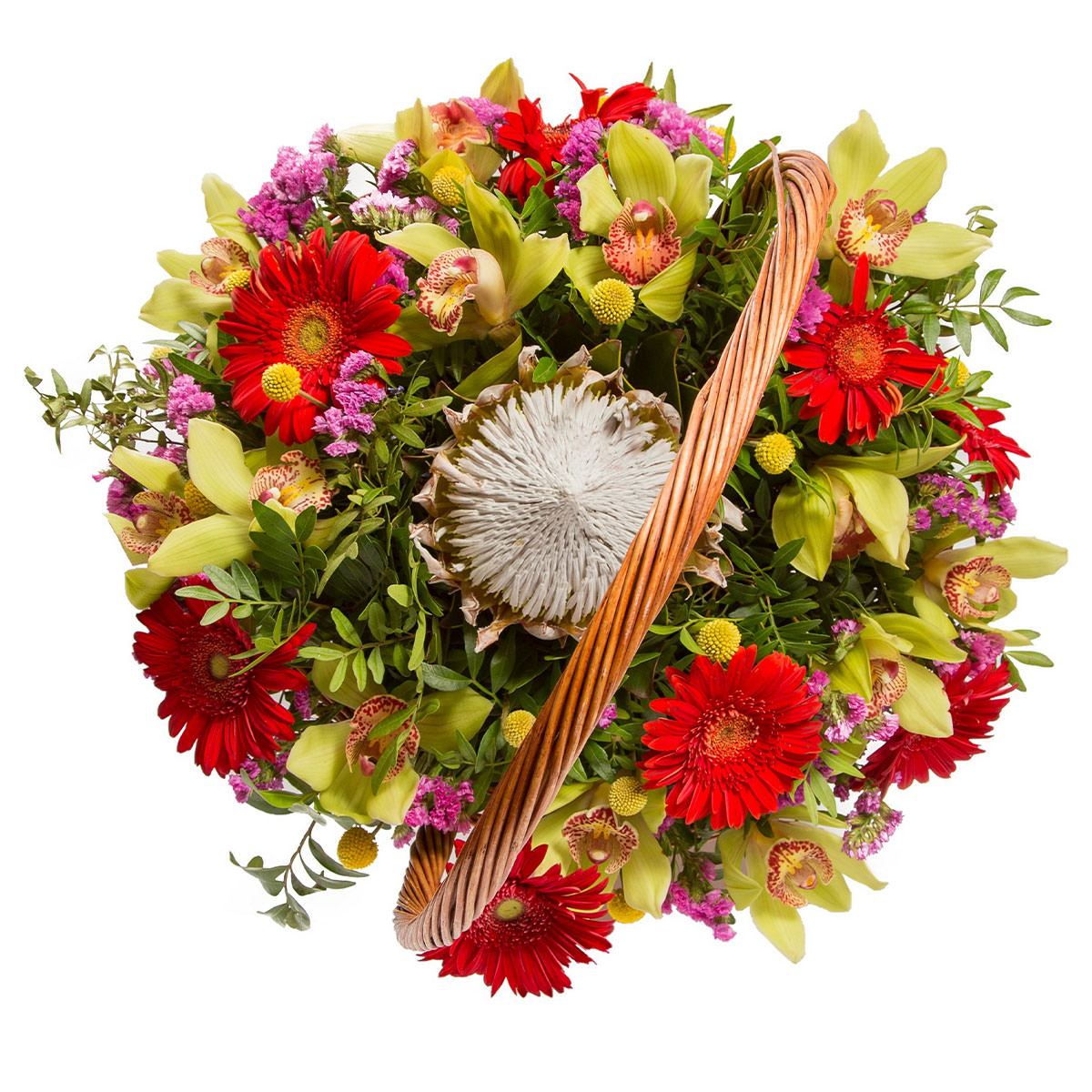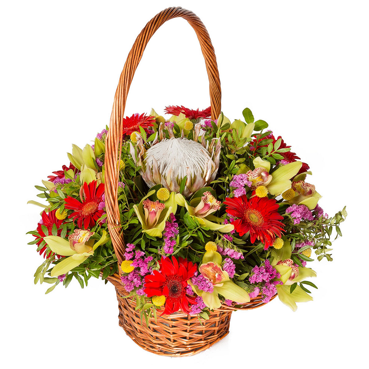 Яркая композиция из желтых орхидей, оранжевых гербер, артишоковой протеи и розовой статицы создает атмосферу праздника. Плетёная корзина добавляет естественности и уюта. Возможны альтернативы оформления: корзина из лозы или ротанга. Прекрасный выбор для юбилея или для любимой.
