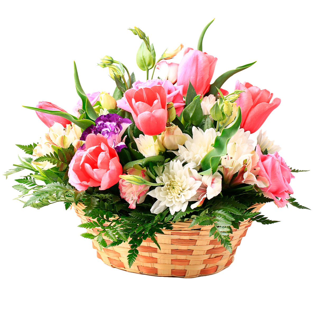Яркие розовые тюльпаны, белоснежные хризантемы и альстромерии, фиолетовые гвоздики и свежая зелень создают неповторимую композицию. Корзина из натуральной лозы подчеркивает естественную красоту цветов. Возможны варианты оформления с плетёной корзиной или корзиной из ротанга. Прекрасный подарок для мамы на День матери или для любимой на 8 марта.