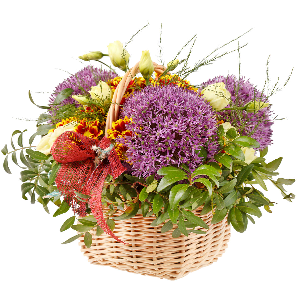 Яркая композиция из аллиума, белой эустомы и желто-красной кустовой хризантемы, дополненная свежей зеленью, создает атмосферу праздника. Корзина выполнена из натурального материала и украшена красной лентой. Возможны варианты оформления в плетёной или ротанговой корзине. Прекрасный подарок для любимой на день рождения или годовщину.