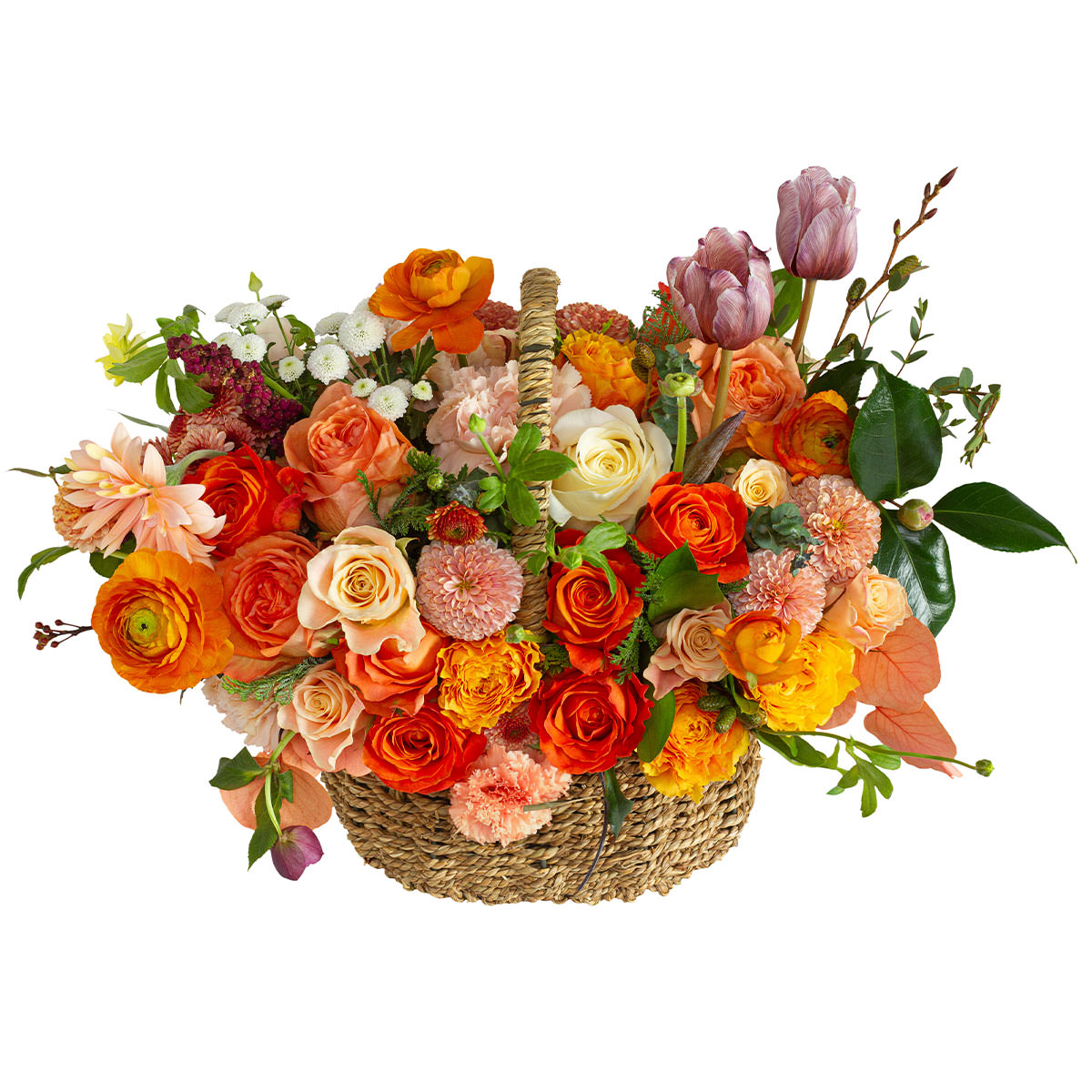 Яркая композиция из разноцветных роз, оранжевых ранункулюсов, розовых гвоздик, белых кустовых хризантем, сиреневых тюльпанов и циннии Салмон Роуз создаёт атмосферу праздника. Корзина из натурального материала подчёркивает естественную красоту цветов. Возможны альтернативы оформления: корзина из лозы или плетёная корзина. Прекрасный подарок для любимой на день рождения или годовщину.