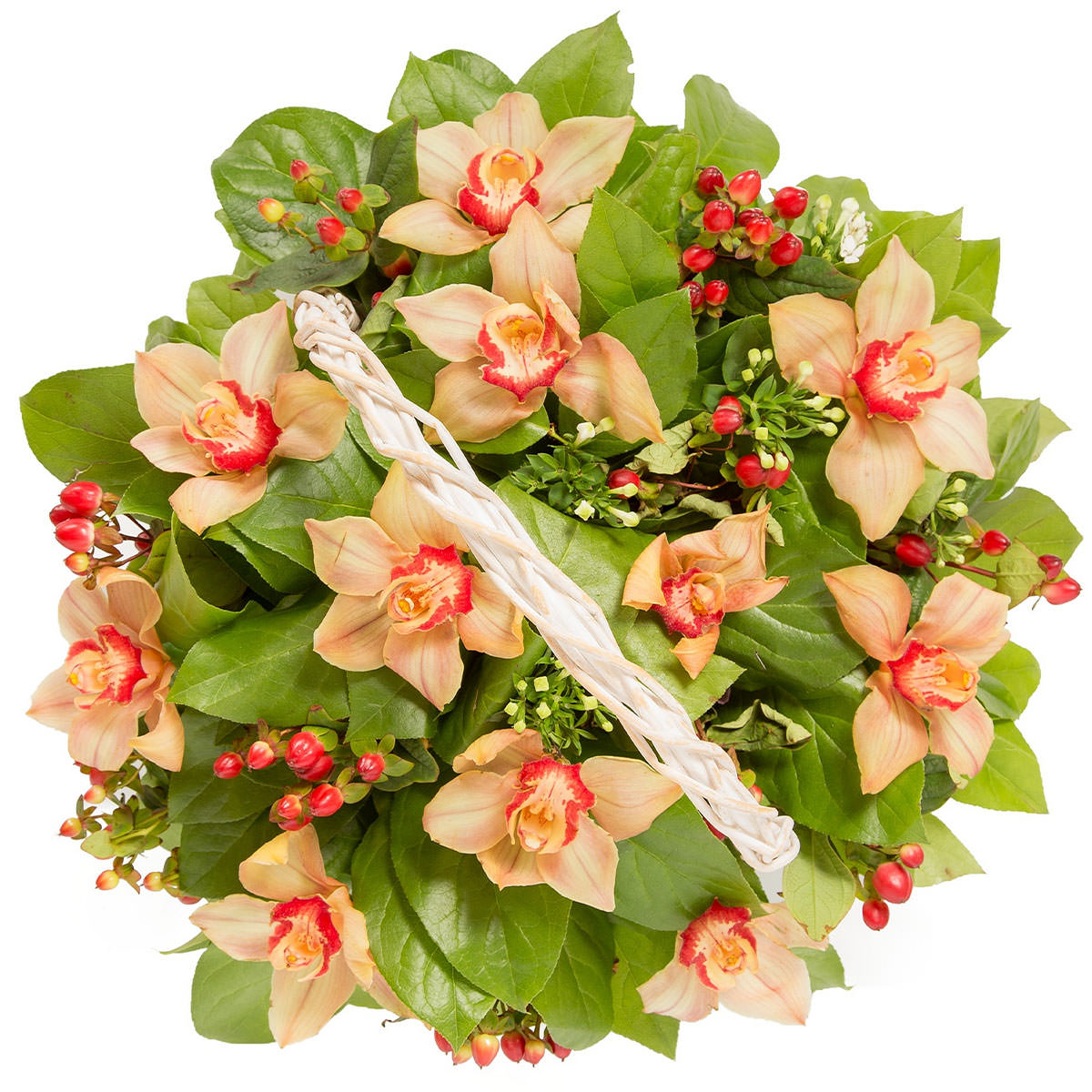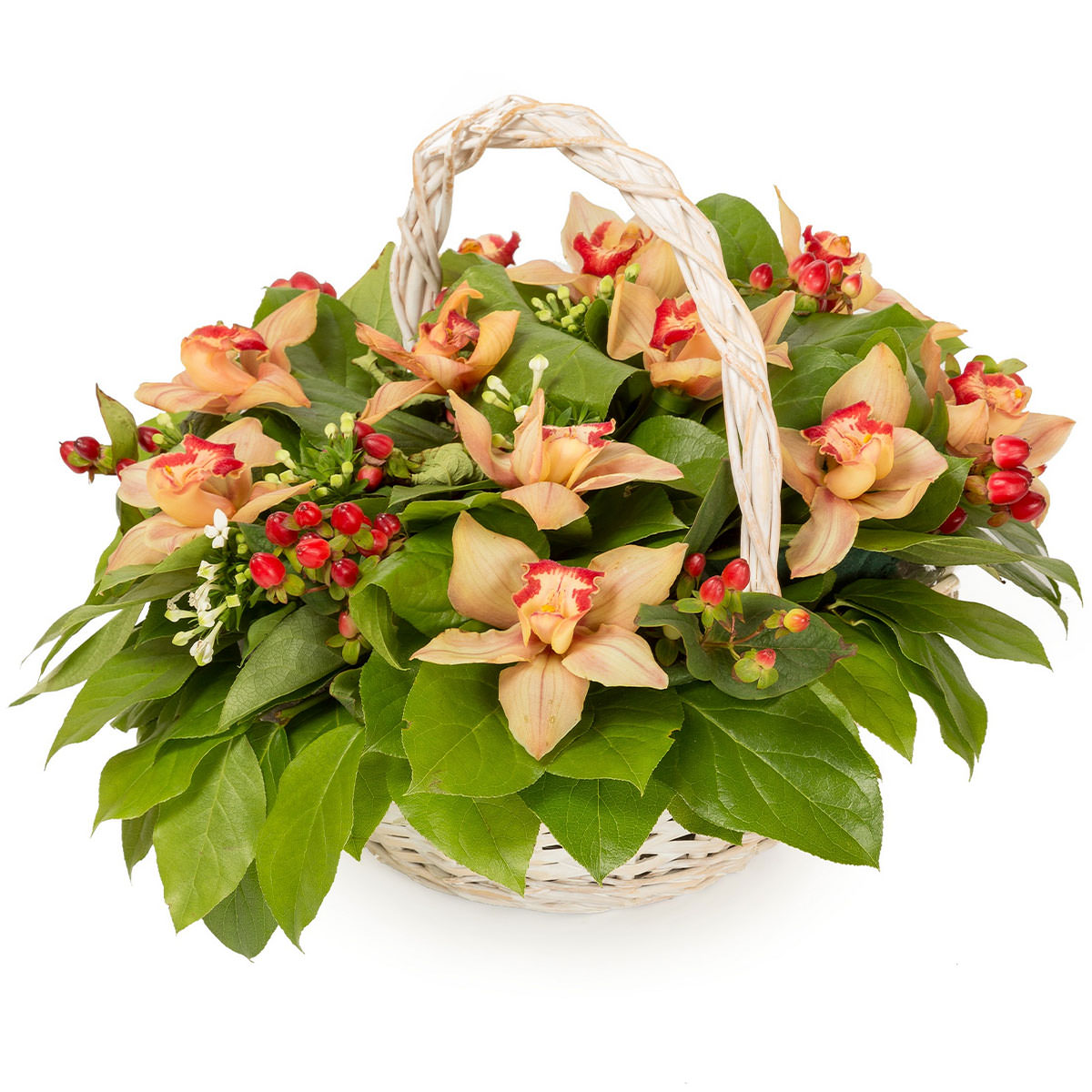 Персиковые орхидеи в сочетании с гиперикумом и свежей зеленью создают нежную цветочную композицию. Корзина из лозы придаёт композиции естественность и шарм. Возможны альтернативы оформления: корзина из ротанга или с тканевой отделкой. Прекрасный подарок для любимой на годовщину или день рождения.