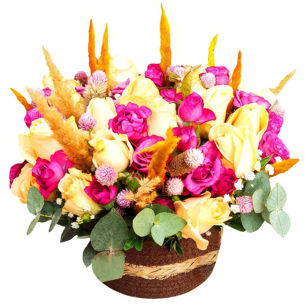 Эта изысканная композиция сочетает в себе кремовые и розовые одноголовые розы, дополненные нежной гипсофилой и эвкалиптом. Сухоцветы придают особую текстуру и шарм. Корзина выполнена из ротанга, что добавляет естественности и стиля. Альтернативно, можно оформить в корзине из лозы или с тканевой отделкой. Прекрасный выбор для подарка на годовщину или для любимой.